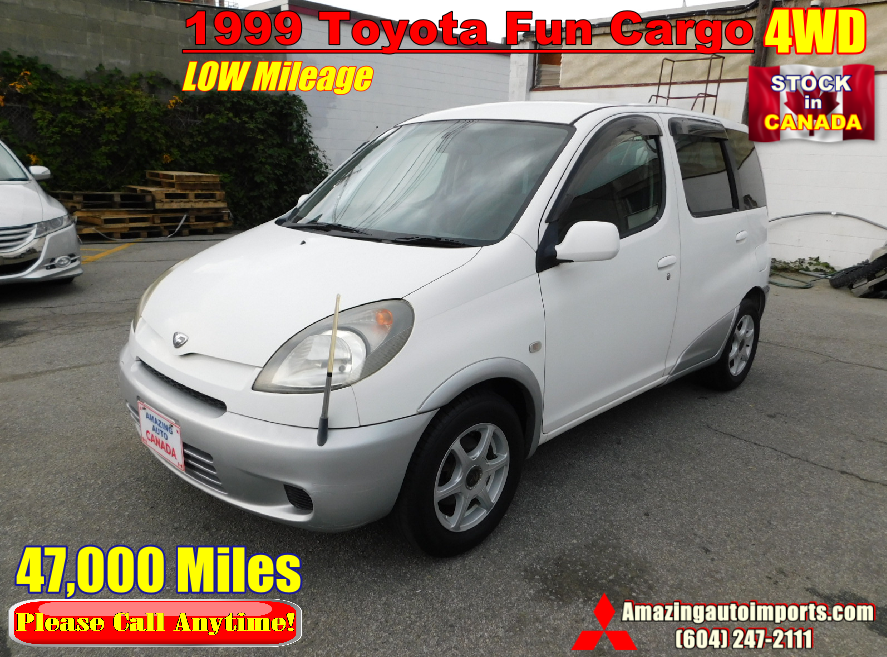 1999 Toyota Fun Cargo Hatchback 4WD Low Mileage. With LOW Mileage of 47,000 Miles. 4 Cylinders,1.4 Liters, 1400cc, Gas, 4WD, Automatic Transmission.